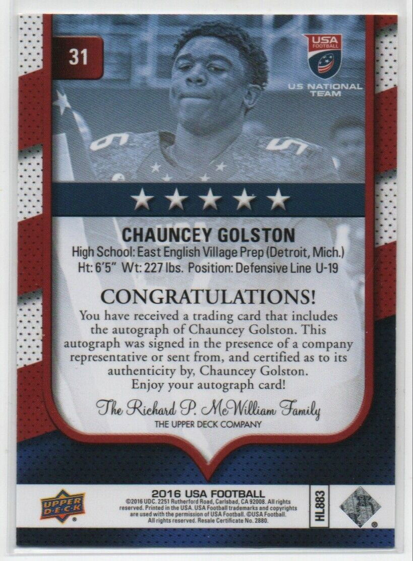 2016 Upper Deck USA Football USA U19 Auto Auto Chauncey Golston #31 Auto