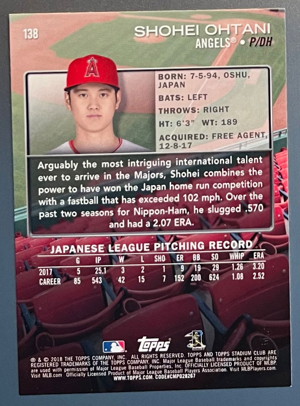 Shohei Ohtani 2018 Stadium Club photo variation RC